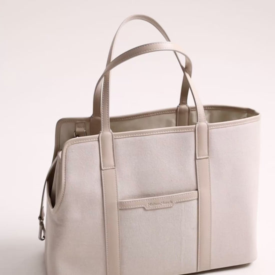 The Cream London Tote Bag Dog Carrier blends refined functionality with light, everyday elegance. Crafted from sturdy canvas with smooth cream vegan leather trim, it offers a structured silhouette that keeps its shape while supporting your dog in comfort. Inside, a velour lining and removable safety strap provide softness and security, while the neutral exterior complements any outfit — for you and your dog.